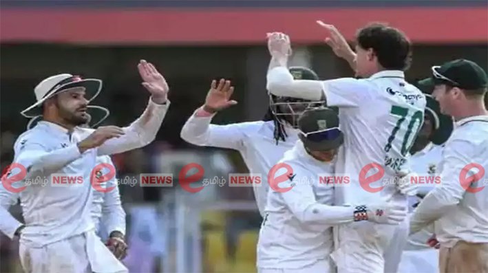 ஜடேஜா மட்டும் தாக்கு பிடித்து (54) அரைசதம் அடித்தார். எஞ்சிய வீரர்கள் அடுத்தடுத்து ஆட்டமிழந்ததால், இந்திய அணி 140 ரன்னுக்கு சுருண்டது. இதன்மூலம், 408 ரன் வித்தியாசத்தில் தென் ஆப்ரிக்க அணி வெற்றி பெற்றது. அந்த அணியின் தரப்பில் ஹார்மர் 6 விக்கெட்டையும், மகாராஜ் 2 விக்கெட்டையும், மார்கோ, முத்துச்சாமி ஆகியோர் தலா ஒரு விக்கெட்டையும் கைப்பற்றினர்.2-0 என்ற கணக்கில் தொடரை வென்ற தென்ஆப்ரிக்க அணி, 25 ஆண்டுகள் கழித்து இந்திய மண்ணில் தொடரை வென்றுள்ளது.