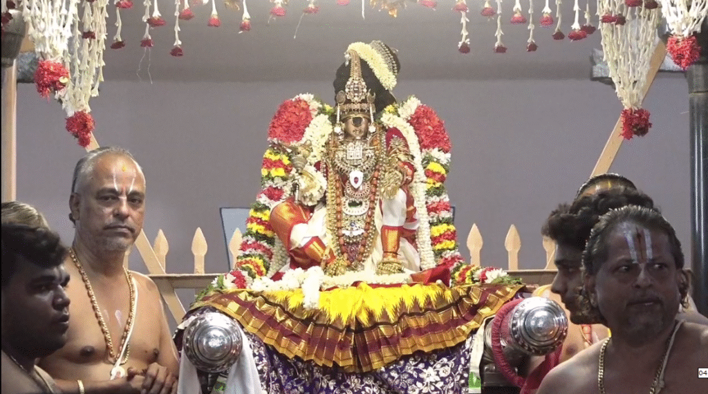தொங்கல் பதக்கம், வரிசையாக அடுக்கு பதக்கங்கள், பெரிய பவழ மாலை, காசு மாலை,2 வட‌முத்து மாலை, வலது திருக்கையில் – தங்க கோலக்கிளி, இடது திருக்கையில் – வரிசையாக வில்வ பத்ரம், தாயத்து சரங்கள், வளையல், பவழ கடிப்பு , வில்வ பத்ர தொங்கல் சாற்றி,திருவடியில் – சதங்கை ,
