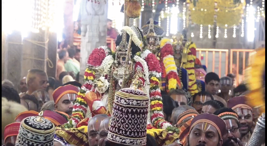 ஸ்ரீரங்கம் ரங்கநாதர் கோவிலில் ஆண்டுதோறும் நடைபெறும் வைகுண்ட ஏகாதசி விழா விமர்சையாக நடைபெற்று வருகிறது. பகல் பத்து, ராப்பத்து என நடைபெறும் வைகுண்ட ஏகாதேசி விழாவின் பகல் பத்து 10- ஆம் நாள் இன்று உற்சவர் நம்பெருமாள் சௌரிக் சாயக் கொண்டை சாற்றி, அதில் கலிங்கத்துராய், சூர்ய – சந்திர வில்லை, சிகப்பு கல் நெற்றி பட்டை, முத்து பட்டையை பக்க வாட்டில் கொண்டையில் அணிந்து காதில் வைர மாட்டல் – தோடு – ஜிமிக்கி , வலது திருமூக்கில் மூக்குத்தி அணிந்து, திருமேனியில் பங்குனி உத்திர பதக்கம், தாயார் வைரத்திருமாங்ஙல்யம்,