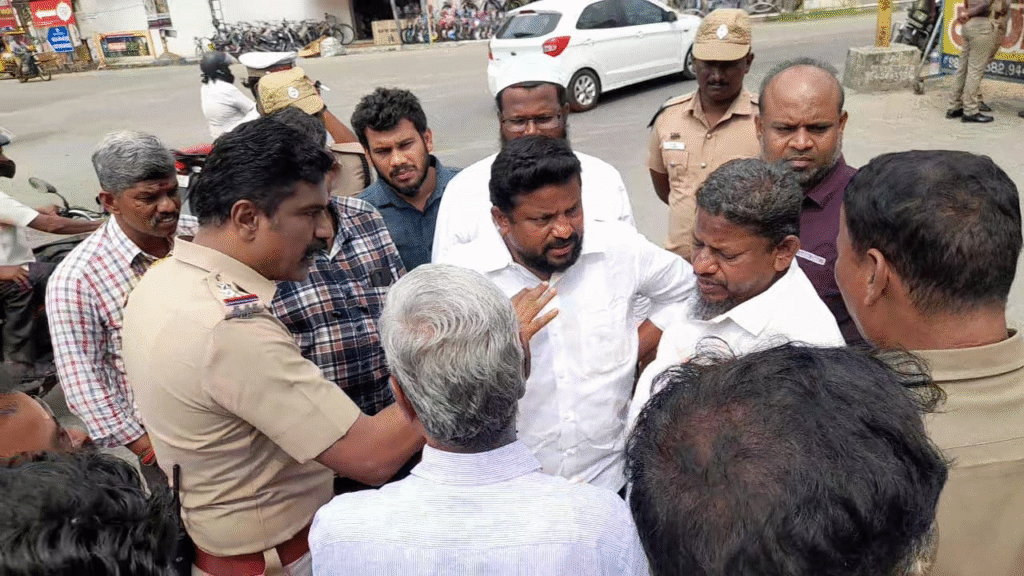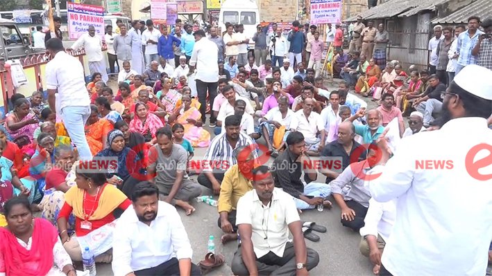 உள்ள தரைக்கடை வியாபாரிகளுக்கு முன்னுரிமை அளித்து கடை வழங்கியதற்கு எதிர்ப்பு தெரிவித்தும், வெண்டிங் கமிட்டி மூலம் அனைத்து தரைக்கடை வியாபாரிகளுக்கும் அடையாள அட்டை வழங்கப்பட்ட நிலையில், அடையாள அட்டை உள்ள அனைவருக்கும் உரிய முறையில் கடைகளை ஒதுக்கீடு செய்யாமல் தன்னிச்சையாக செயல்படுவதை கண்டித்தும் பல்வேறு
