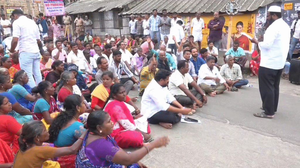 தொழிற்சங்கங்களை சேர்ந்த தரைக்கடை வியாபாரிகள் தெப்பக்குளம் காந்தி சிலையின் அருகில் தர்ணா போராட்டத்தில் ஈடுபட்டு வருகின்றனர். தங்களுக்கு உரிய மாற்று கடை வழங்காவிட்டால் தொடர்ந்து தங்களது போராட்டத்தை தீவிர படுத்தவோம் அதேநேரம் தரைக்கிட வியாபாரிகளின் வாக்கு வங்கிகளை பெற்றுவிட்டு தரைக்கடை வியாபாரிகளுக்கு நேர்ந்த துயரங்களை சற்றும் கண்டு கொள்ளாமல் வேடிக்கை பார்க்கும் அமைச்சர்கள் வீடுகளில் அமர்ந்து போராடுவோம் என்றும் எச்சரிக்கையுடன் தெரிவித்துக் கொண்டனர்.