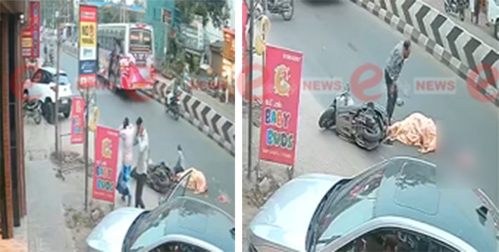 கணவன் கண்முன்னே பஸ்சில் சிக்கி மனைவி பலி.. பரிதாபம்