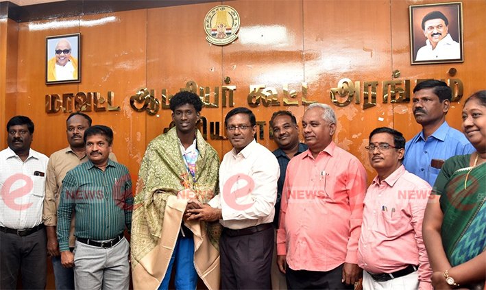 தடகளப் போட்டி-தங்கம் வென்ற மாணவருக்கு பரிசு வழங்கிய கலெக்டர்