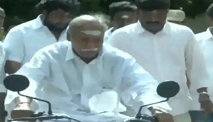 பைக்கில் வந்து வாக்களித்த புதுச்சேரி முதல்வர் ரங்கசாமி