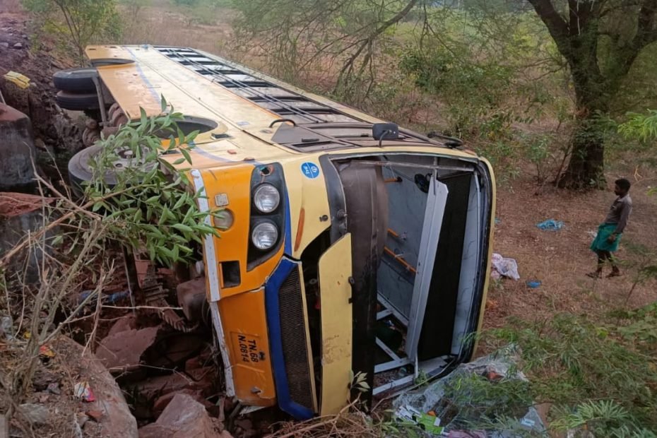 தஞ்சை பஸ் வாய்க்காலில் கவிழ்ந்தது…. பெண் பலி…… 25 பேர் காயம்