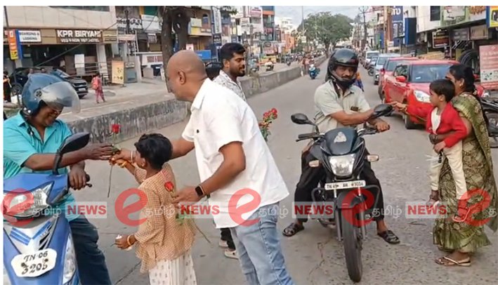 ஹெல்மெட் அணிந்து வருபவர்களுக்கு மலருடன் வரவேற்ற குழந்தைகள்