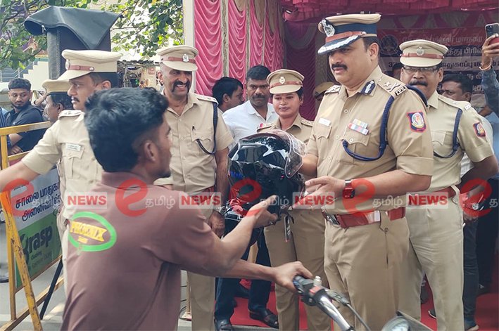 இருசக்கர வாகன ஓட்டிகளுக்கு ஹெல்மெட் வழங்கிய கோவை கமிஷனர்