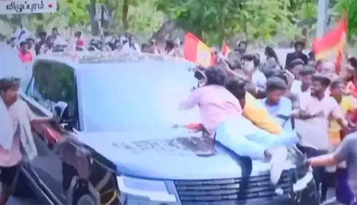 இந்நிலையில் புதுச்சேரி நோக்கி சென்று கொண்டிருந்த விஜய் கார் மீது ஏறிய தொண்டர்கள்