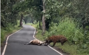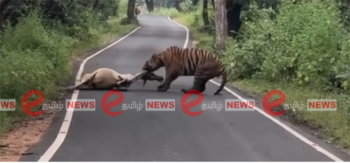 இந்நிலையில் தற்போது வால்பாறை பகுதியில் இருந்து அதிரப்பள்ளி செல்லும் வழியில் புலி ஒன்று மானை வேட்டையாடி சாலையில் இழுத்து சென்றுள்ளது இப்போது அந்த வழியாக சென்ற சுற்றுலா பயணி ஒருவர் இதை தனது செல்போனில் படம் பிடித்து சமூக வலைதளங்களில் பதிவிட்டுள்ள நிலையில் தற்போது இந்த வீடியோவானது வைரலாகி வருகிறது. மேலும் தற்போது வனவிலங்குகளின் நடமாட்டம் தொடர்ந்து அதிகரித்து காணப்படும் நிலையில் சில பயணிகள் மிகுந்த கவனத்துடன் செல்ல வேண்டும் எனவும் வனத்துறையினர் எச்சரிக்கை விடுத்துள்ளனர்.