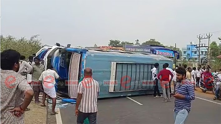 திருச்சி நோக்கி சென்றுகொண்டிருந்தபோது, தஞ்சாவூர் விளார் புறவழிச் சாலை அருகே டிரைவரின் கட்டுப்பாட்டை இழந்து, நிலை தடுமாறி அருகில் உள்ள பள்ளத்தில் வேன் கவிழ்ந்து விபத்தானது.