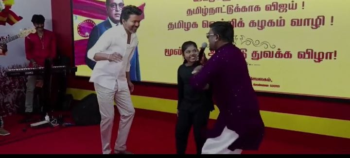 தவெகவின் 3-ம் ஆண்டு தொடக்க விழாவில் கலைமாமணி வேல்முருகன் சிறப்பு பாடல் ஒன்றை பாடினார். இந்த பாட்டை ரசித்து கேட்ட விஜய், மேடைக்கு சென்று வேல்முருகனுக்