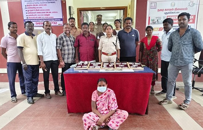 சி.சி.டி.வி.புட்டேஷ் மூலம் அடையாளம் கண்டு போலீஸ் சூப்பிரண்டு அபிஷேக் குப்தா உத்தரவின்பேரில் டவுன் டி.எஸ்.பி.பிருந்தா ஆலோசனை யின்பேரில்புதுக்கோட்டை டவுன் இன்ஸ்பெக்டர் சுகுமாறன் தலைமையிலான போலீசார் கைதுசெய்து திருடிக் சென்ற 35பவுன் தங்க நகைகள்,199கிராம்வெள்ளி, ரொக்கம் ரூ50,000ஆயிரம் ஆகியவற்றை மீட்டனர். பின்னர் அப்பெண்ணை நீதிமன்றத்தில் ஆஜர் படுத்தி சிறையில் அடைத்தனர்.